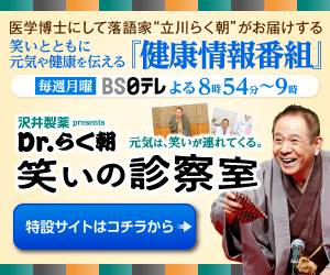 立川 らく朝 ・落語家・医師 (日本内科学会認定内科医、医学博士) ・笑いと健康学会理事 ・日本ペンクラブ会員 1954年1月26日 長野県に生まれる。 1979年 杏林大学医学部卒業。慶応義塾大学医学部内科学教室へ入局。